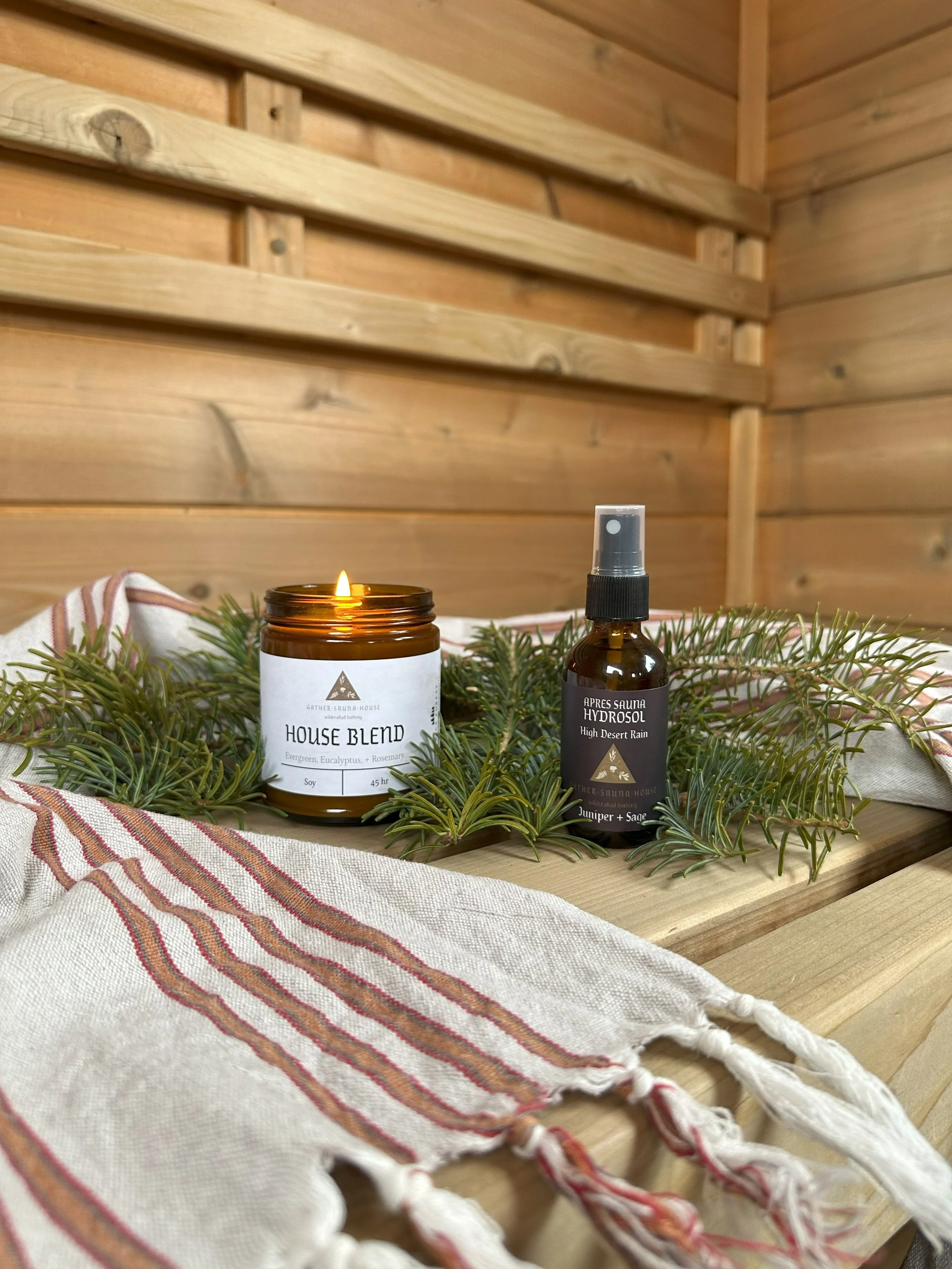 Our Gather “Gotta-Haves” Gift Set includes a gift certificate in the amount of your choice ($50, $75 or $100) plus our luxury quick drying Turkish Towels, one of our locally foraged and house made herbal hydrosols, and our signature house blend candle which allows you to take the scent of our sauna home with you!
